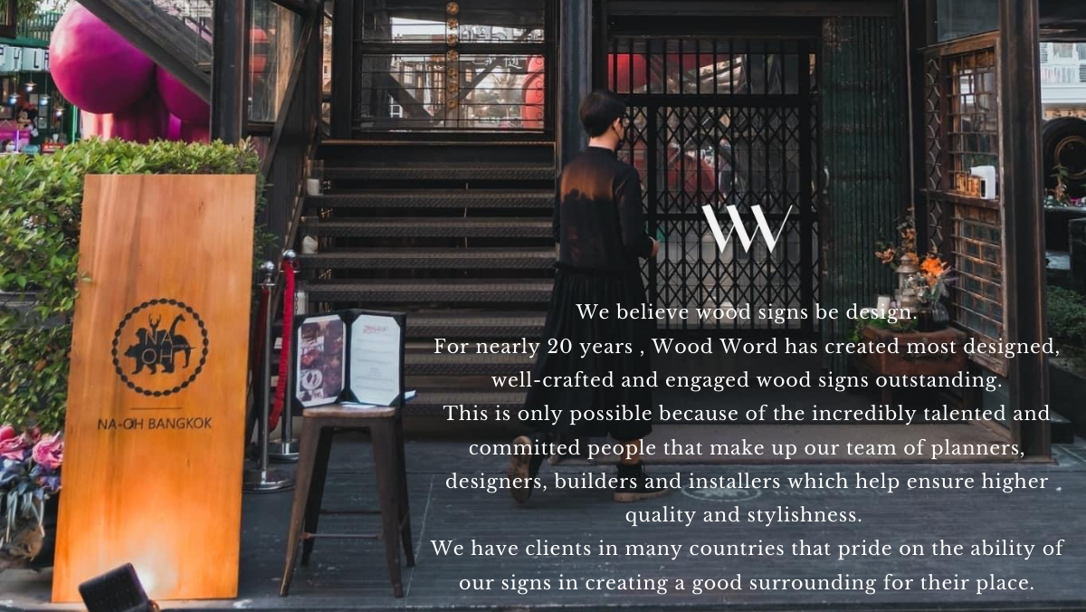 “เราเชื่อว่าป้ายไม้คือศิลปะแห่งการออกแบบ ตลอดเกือบ 20 ปี Wood Word ได้รังสรรค์ป้ายไม้ที่งดงาม ประณีต และเปี่ยมด้วยเอกลักษณ์ นี่คือผลลัพธ์จากทีมงานนักออกแบบ ช่างฝีมือ และผู้ติดตั้งที่ทุ่มเททุกขั้นตอน เพื่อให้ได้งานคุณภาพสูงและเต็มไปด้วยสไตล์ ลูกค้าของเราหลายประเทศต่างภาคภูมิใจ ที่ป้ายไม้สามารถสร้างบรรยากาศอันอบอุ่นและโดดเด่นให้กับสถานที่ของพวกเขา”